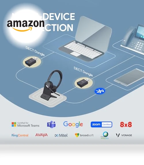 Meet the Yealink WH64 Hybrid Wireless Headset—your new office hero. It's like having the best of both worlds: DECT technology for that rock-solid, secure connection (and a wireless range that'll let you wander up to 492 feet without dropping a call) plus Bluetooth for when you need to move around. Perfect for those endless Teams and Zoom marathons, it comes with a microphone that actually listens to you, a busylight to scare off interruptions, and quick mute settings for when you need to, well, not be heard. And with battery life that lasts up to 32 hours of talk time (because who has time to charge?), it's basically unstoppable. Oh, and it's smart too—AI noise-canceling tech and a microphone that cuts out background noise three times better than your average headset mean your calls are crystal clear. Plus, it plays nice with pretty much anything—desk phones, computers, mobile phones, you name it.