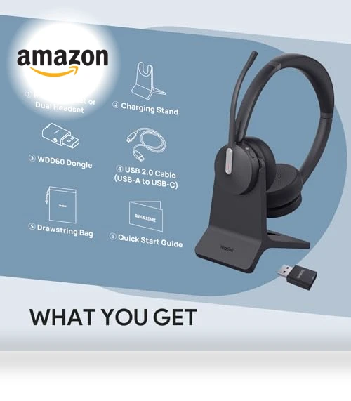- included_components: USB 2.0 Cable (USB-A to USB-C), Charging Stand, User Manual & Drawstring Bag, Mono headset or Dual headset, WDD60 DECT Dongle
