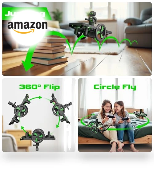 🚁 Flying Quadcopter & Jumping Car: Imagine this—your kid's new favorite toy can soar through the air like a drone or zip around the floor like a car. And when it hits a snag? Just jump over it! Those 2 wheels aren’t just for show; they make land movement smooth, while the jumping feature turns obstacles into part of the fun.