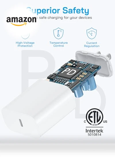 What’s in the box? Oh, just 2x 20W USB C chargers and 2x 6Ft USB-C to USB-C cables—because one is never enough. These aren’t your average cables; they’re built tough with reinforced connectors to survive your bag’s black hole and push 5A high-current for that sweet, sweet speed. Plus, they’re UL/FCC approved, with built-in shields against over-voltage, over-current, and overheating. Safety first, speed second.