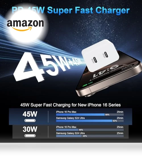 Say goodbye to slow charging and hello to lightning-fast power with our 45W Dual USB C Fast Charger Block. It's not just for your iPhone 16 Pro Max—though it loves that gadget like peanut butter loves jelly. iPads, Samsung Galaxy models, and more? They're all in the club. This charger's the Swiss Army knife of power adapters.