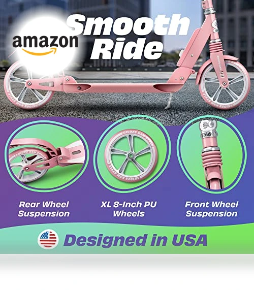 Meet the Skidee Adjustable Height Folding Scooter—your go-to ride whether you're 8 or 80 (okay, maybe not 80, but you get the idea). It's got this nifty adjustable handlebar that slides from 31.5" to 41", so it grows with your kid or just adjusts to your mood. Ever hit a bump and felt like your teeth were rattling? Not with these 8-inch polyurethane wheels and dual suspension; it's like riding on a cloud, even when the sidewalk's more obstacle course than path. And yeah, it can handle up to 220 lbs, so no need to skip dessert. Plus, it folds up with a carry strap included, because who has extra hands these days? Pick a color that screams 'you' and hit the road.