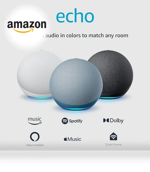 The Amazon Echo (latest version) takes your home audio to the next level with top-notch sound quality, smartly adapting to whatever room you're in. Dive into crystal-clear HD audio with services like Amazon Music HD. Just ask, and it'll play your favorites from Amazon Music, Apple Music, Spotify, and others.
