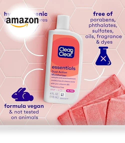 Meet your skin's new best friend: the Clean & Clear Essentials Dual Action Oil-Free Facial Moisturizer. Designed with acne-prone skin in mind, this little miracle worker does double duty—moisturizing your skin while kicking acne to the curb with salicylic acid. Say goodbye to greasy feelings and hello to hydration that doesn't clog your pores. (Because who needs that kind of drama?)