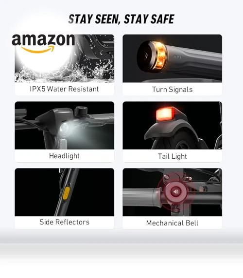 - Special Features: Dual Brakes, Foldable Handlebars, UL 2272 Certified, Turn Signals, Front Suspension