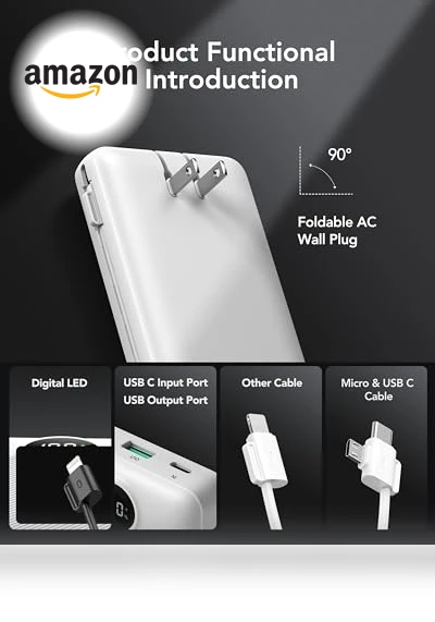 Meet the VRURC Power Bank 20000mAh—your new best friend in the wild world of dying batteries. It's not just a power bank; it's a lifeline with a built-in AC wall plug and cables (micro and USB C, because who has time to remember extra accessories?). Plus, its 90-degree folding design means it won't play hide and seek in your bag.