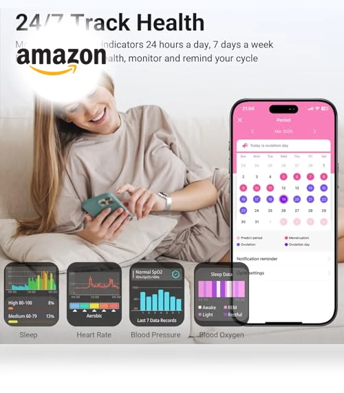 But it's not all about burning calories. This watch is like having a mini health clinic on your wrist, offering 24/7 health monitoring that keeps tabs on your heart rate, how well you're sleeping (or not), and even stress levels, with a little extra love for women's health.