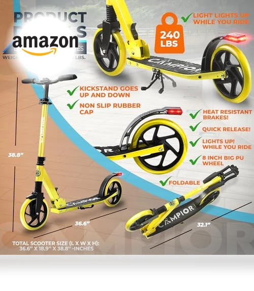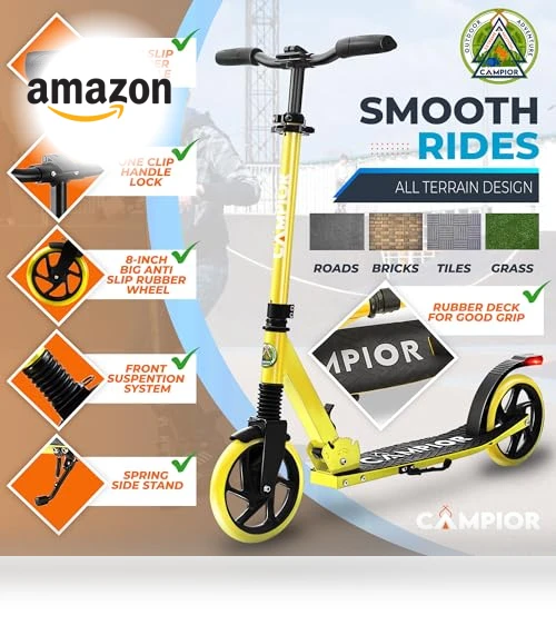 ๐ Smooth and Safe Ride: Ever felt like you're gliding on air? That's the Campior Kick Scooter for youโsleek PU wheels and a deck wide enough to give your feet some breathing room (and extra grip, because safety first). Stopping? Just a quick tap on the rear wheel with your foot, and you're good. Easy peasy.