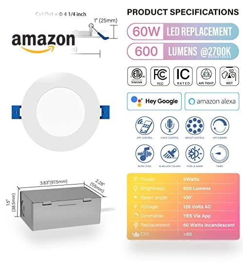 - Special Features: APP Control, Works with Alexa or Google Home, Canless Solution & Wet Location, RGB Color Changing, 2700-6000K Turnable White, Music, Mic Sync & Timer & Group Control, ETL, FCC Certified, IC Rated