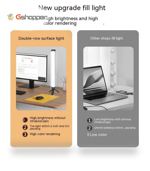 Ever felt like your live streams could use a bit more...oomph? Enter the Live Broadcast LED Fill Light, your desktop's new best friend. 🌟 With its double row fill light, it's like flipping the switch from 'meh' to 'wow'—instantly brightening up your broadcast room and giving it that cozy, anchor-ready vibe. Whether you're gaming, teaching, or just chatting away, this little powerhouse makes sure you look your best.