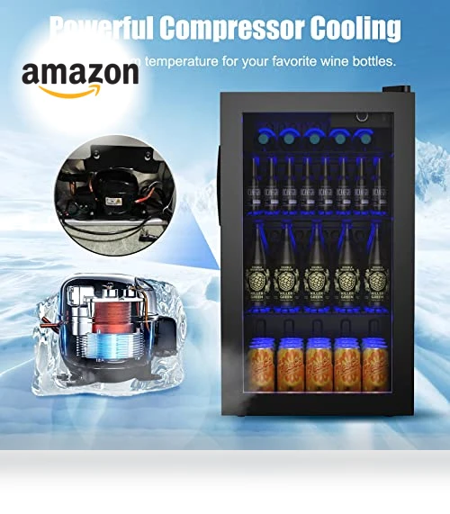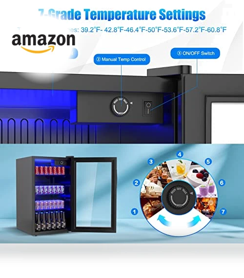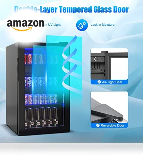 Sunlight sneaking in? Not on this fridge's watch. Its double-layer tempered glass door laughs in the face of strong sunlight and keeps the outside air at bay, while a tight seal locks in the cold like a vault. Left or right? The door swings both ways, thanks to sturdy hinges that don't play favorites. Operating quieter than a whisper (≤40dB, to be exact) and lit with a cool blue LED light for those midnight snack raids, this fridge is the silent guardian of your drinks. At 17.5” x 19” x 31”, it's the space-saving hero for cramped apartments, home bars, offices, or even your workshop—because hydration (or celebration) knows no bounds.