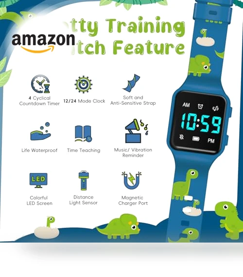 Who knew a watch could turn potty time into party time? Meet the Potty Training Watch, your toddler's new best friend (and your secret weapon) for ages 2-9. It's not just about telling time—it's about making those bathroom breaks something they'll actually look forward to, thanks to adjustable timers and reminders that are more cheerleader than chore. Plus, with a bright LED display that's a breeze for little eyes to read and a design that's as gentle on sensitive skin as it is tough enough for toddler adventures, it's a win-win.