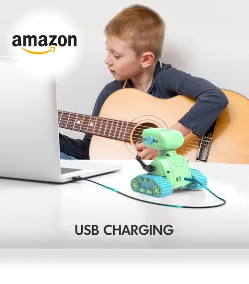 This little robot is packed with surprises. Imagine this: LED eyes that can glow, blink, or shut off with just a press of a button. It chats away in its own quirky language and belts out not one, not two, but three catchy tunes. And when it's showtime, watch it glide smoothly on tank tracks in any direction or bust a move in demo mode. Talk about a performer!