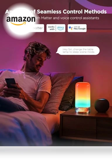 But wait, there’s more! Fancy a light show? Dive into over 64 preset scenes (Valentine and Aurora, anyone?) or let the lamp groove to your tunes with 8 music sync modes. Party at home just got an upgrade. Plus, it plays nice with Alexa, Google Home, and HomeKit, thanks to Matter support. Smart home? Sorted.