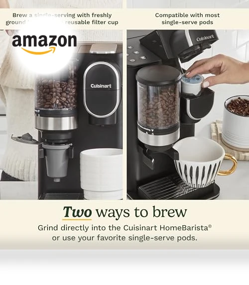 - included_components: Grind & Brew Single-Serve Coffeemaker, Cuisinart’s HomeBarista ® Reusable Filter Cup, charcoal filter, Removable drip tray