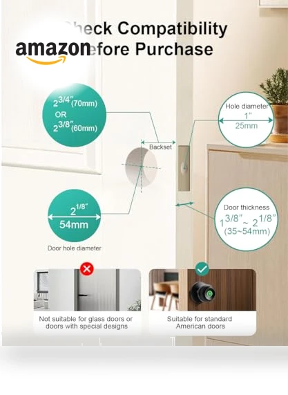 | special_feature | Fingerprint, app, keys unlock, auto lock, Privacy/Normal/Passage Mode, Share or add Members, view history logs, Mute Mode | Waterproof Durable, 5s Auto-locking, 3 Ways Smart Door Knob, AI Fingerprint Self-learning | Keyless Entry | Auto lock, Passage Mode, Private Mode, Mute Mode, Fingerprint/Password/APP/Keys Unlock, Member Management | Alarm, Anti-Corrosion, Anti-Drill, Anti-Peeping Password, Auto-Lock, Back-Lit Keypad, Fingerprint, Fob Unlock, Heat Resistant, One-Touch Lock, Passcode Unlock, Rechargeable, Resettable, Shackleless, Touchscreen, Weather Resistant | |