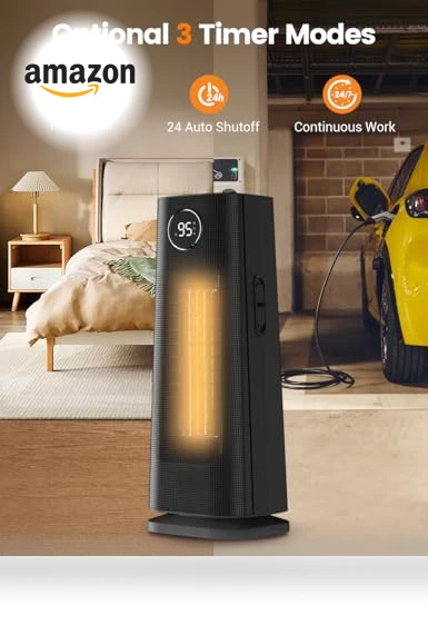 | Special Feature | Cool Touch Exterior, Digital Display, Electronic Thermostat, Overheat Protection, Adjustable Thermostat from 41 to 99°F, 80° Wide Oscillation, 24Hrs Auto off, 24*7 Always-On Mode, LED Digital Display, 3 Heating Modes, ECO Mode, Remote Control (Battery not included), 1-24 Hrs Timer, Memory Function, Tip-over Protection | Digital Display, Remote Control, 24H Timer, 3D Heating, 29s Fast Heating, 4 Mode Settings, Adjustable Temperature, Noiseless, Overheat Protection, Tip-Over Protection, Electronic Thermostat, Energy Efficient, Wheels | Remote Control, 90° Wide Oscillation, Tip-Over & Overheat Protection, Adjustable Thermostat 59-99°F | Remote Control, Oscillating, Overheat Protection | ||