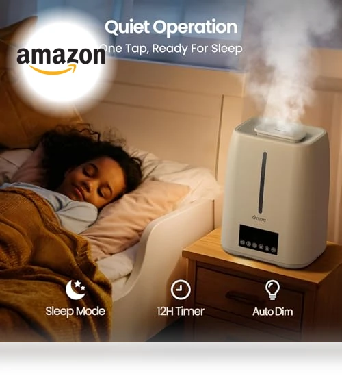 Here's the kicker: it's smart. The smart auto mode tweaks the mist based on your room's humidity, so you can set it and forget it. And when it's time to hit the hay, sleep mode kicks in, dialing down the noise to a whisper-quiet 28dB and dimming the lights so you can drift off without a hitch.