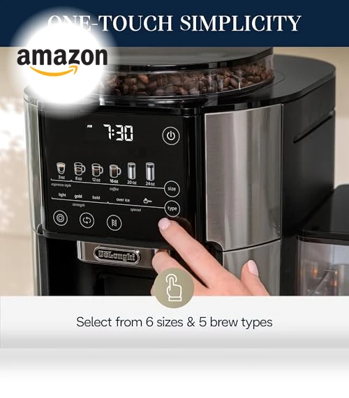 Now, let's talk features because this baby's got some tricks up its sleeve. First off, there's De'Longhi's Bean Extract Technology (fancy, right?) that ensures every sip is packed with flavor and aroma. Whether you're a light roast lover or a bold brew fanatic, it's got you covered with 6 sizes and 5 brew styles—yes, including that oh-so-refreshing Over-Ice option for those sweltering summer days. And for the forgetful among us (no judgment), the built-in clock and auto-on function mean you can wake up to the smell of coffee without lifting a finger. Plus, it's a win for the planet—no plastic pods or filters here, just pure, unadulterated coffee goodness.