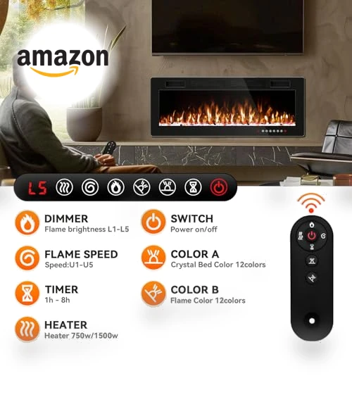 Here’s the scoop on what makes it tick: You’ve got a rainbow at your fingertips with 12 flame and firebed colors (mood lighting, anyone?). Play around with the flame speed and brightness across 5 levels—because sometimes you want a gentle flicker, other times a roaring blaze (sans the firewood hassle). Need heat? Flip between 750W for a cozy vibe or 1500W when you’re actually cold. And with touch screen controls, even your tech-challenged uncle can figure it out. Plus, it’s got your back with overheat protection and a timer, because safety never takes a day off.